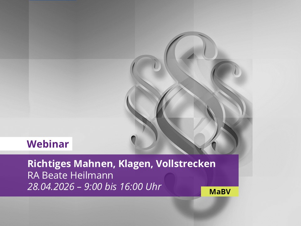 Richtiges Mahnen, Klagen und Vollstrecken – Inhalte: Wenn Mieter ihren vertraglichen Zahlungsverpflichtungen nicht nachkommen, verbleibt für den Vermieter oftmals nur der Weg der gerichtlichen Titulierung der Forderungen und einer nachfolgenden Zwangsvollstreckung. Das Online-Seminar vermittelt die erforderlichen…
