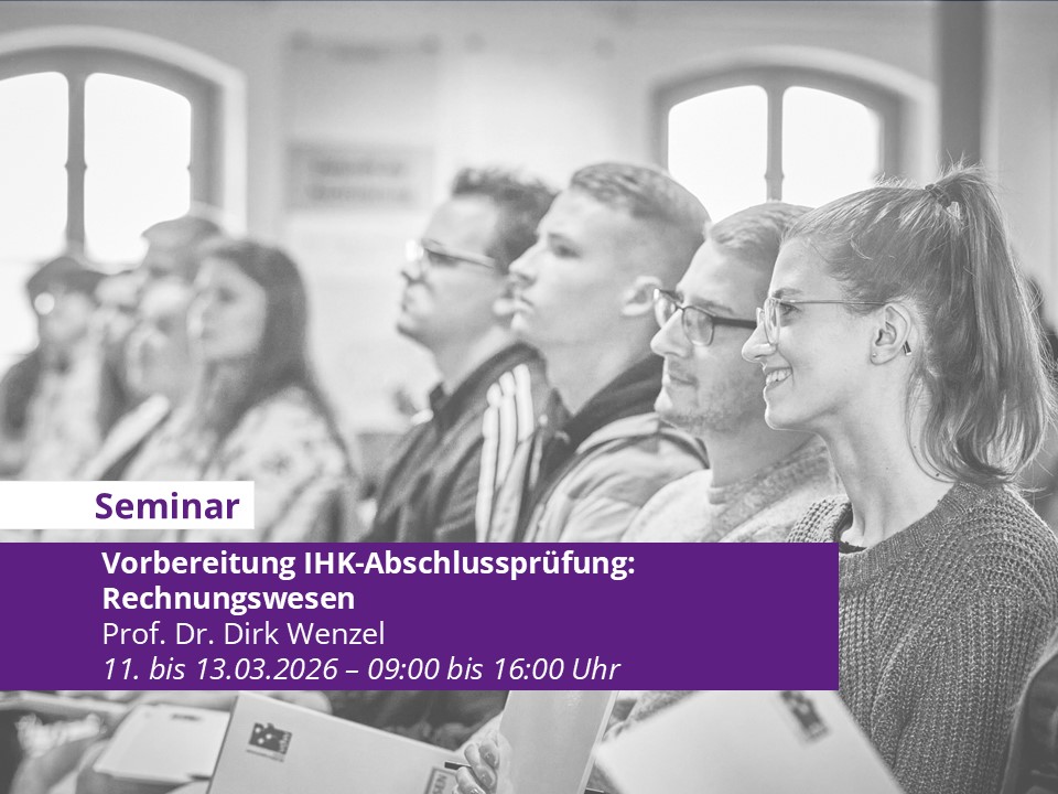 Vorbereitung IHK-Abschlussprüfung: Rechnungswesen – Inhalte: Der Vorbereitungskurs dient als Gesamtwiederholung des Lernstoffs mit besonderem Blick auf die IHK-Abschlussprüfung im Bereich Rechnungswesen. Schwerpunkte des Seminars sind: Prüfungsrelevante Grundfragen der Finanzbuchhaltung Geschäftsprozesse I (Mietenbuchhaltung, Erfassung…
