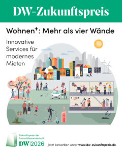 Der DW-Zukunftspreis der Immobilienwirtschaft 2026 steht unter dem Motto „Wohnen⁺: Mehr als vier Wände“ und prämiert innovative Services für modernes Mieten. Ausgezeichnet werden Lösungen, die durch zukunftsweisende Wohnformen und/oder andere innovative Angebote spürbaren Mehrwert für Mieterinnen und Mieter schaffen. Unternehmen können sich ab sofort bis zum 31. Januar 2026 bewerben.